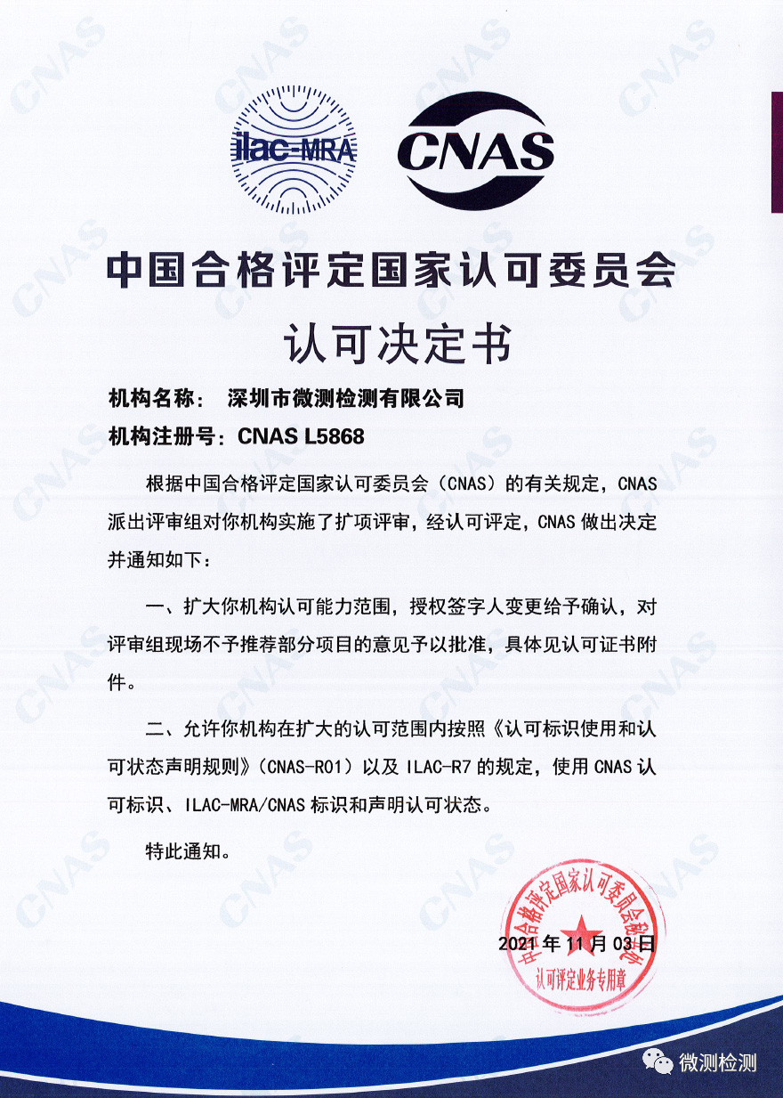 此次微測檢測在化學、微生物、電子電器EMC、汽車電子EMC、安規、電池、車載語音通話質量等領域擴項達300余項;其中